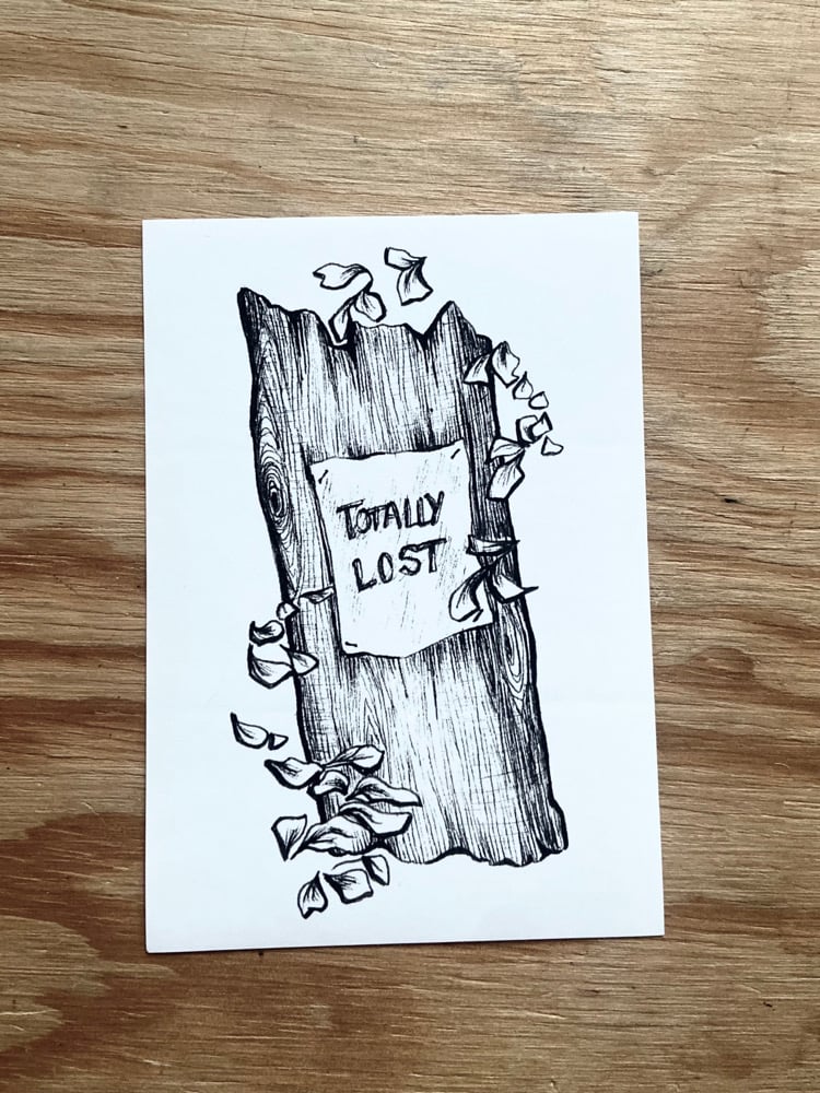 A sticker printed sticker from a pen and ink drawing depicting a missing sign on a tree.